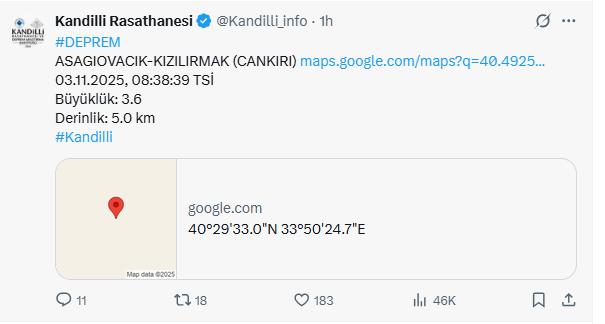 Kandilli sosyal medya hesabı üzerinden yaptığı paylaşımda depremin saat 08.38'de 3.6 büyüklüğünde gerçekleştiğini belirtti. Kızılırmak merkezli deprem yerin 5.0 kilometre derinliğinde kaydedildi.