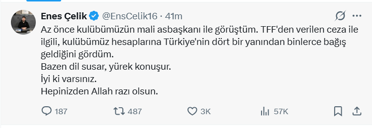 Az önce kulübümüzün mali asbaşkanı ile görüştüm. TFF'den verilen ceza ile ilgili, kulübümüz hesaplarına Türkiye'nin dört bir yanından binlerce bağış geldiğini gördüm. Bazen dil susar, yürek konuşur. İyi ki varsınız. Hepinizden Allah razı olsun.