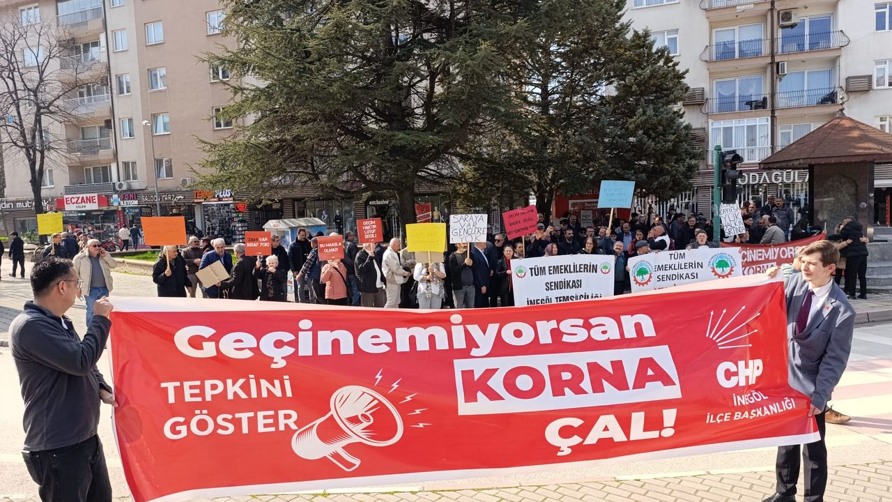 İnegöl AVM karşısında düzenlenen eylemde CHP yönetimi ve üyeleri ellerinde "Geçinemiyoruz. Tepkini göster, korna çal", "Bu maaşla olmaz", "Zam var, insaf yok" yazılı dövizler taşıdılar.