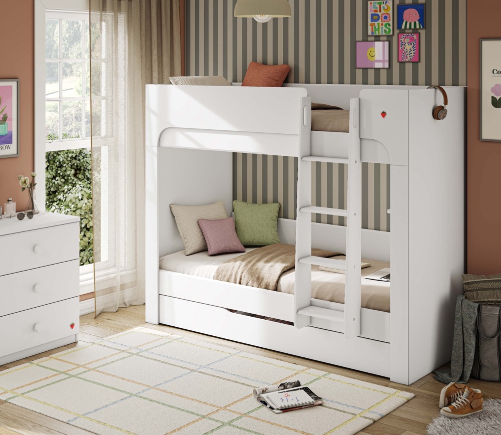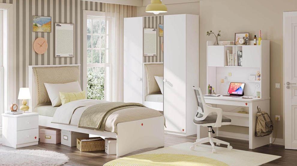Varia Beyaz, minimalist tasarımıyla her yaşa hitap eden, hafif ama etkili bir dekorasyon dili sunarak çocuk ve genç odalarına modern bir ferahlık getiriyor.