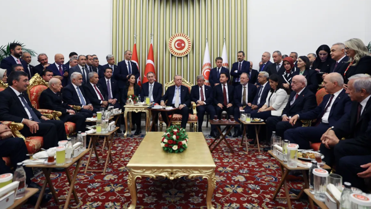 Resepsiyona katılan Cumhurbaşkanı Recep Tayyip Erdoğan; MHP Genel Başkanı Devlet Bahçeli, DEM Parti Eş Genel Başkanları Tuncer Bakırhan ve Tülay Hatimoğulları Oruç, DEVA Partisi Genel Başkanı Ali Babacan, Gelecek Partisi Genel Başkanı Ahmet Davutoğlu, BBP Genel Başkanı Mustafa Destici, HÜDA PAR Genel Başkanı Zekeriya Yapıcıoğlu ve milletvekilleriyle sohbet etti.