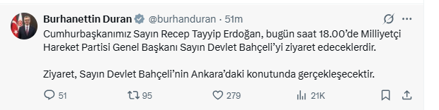 İletişim Başkanı Burhanettin Duran, sosyal medya hesabı üzerinden yaptığı paylaşımda Cumhurbaşkanı Recep Tayyip Erdoğan'ın bugün saat 18.00'de MHP Genel Başkanı Devlet Bahçeli'yi ziyaret edeceğini açıkladı. Yapılan paylaşımda görüşmenin Bahçeli’nin Ankara’daki evinde gerçekleşeceğini belirtildi.