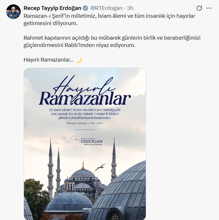 Cumhurbaşkanı Erdoğan, sosyal medya hesabından yaptığı açıklamada, Bakara Suresi'nin 183'üncü ayetini paylaşarak Ramazan ayının hayırlı geçmesini diledi.