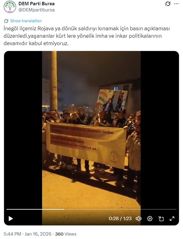 Düzenlenen eylemi sosyal medya hesabından paylaşan DEM Parti Bursa il başkanlığı şu ifadeleri kullandı; “İnegöl ilçemiz Rojava’ya dönük saldırıyı kınamak için basın açıklaması düzenledi. Yaşananlar Kürtlere yönelik imha ve inkar politikalarının devamıdır kabul etmiyoruz.”