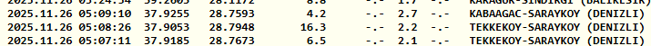 Paylaşıma göre merkezi Sarayköy olan ilk deprem saat 05.07'de 2.1 büyüklükte gerçekleşti. Ardından 2.2 büyüklüğünde bir deprem daha meydana geldi. Kandili bu depremin saat 05.08'de 16.3 kilometre derinlikte gerçekleştiği bildirdi. Son deprem ise saat 05.09'de 2.7 büyüklüğünde kaydedildi.