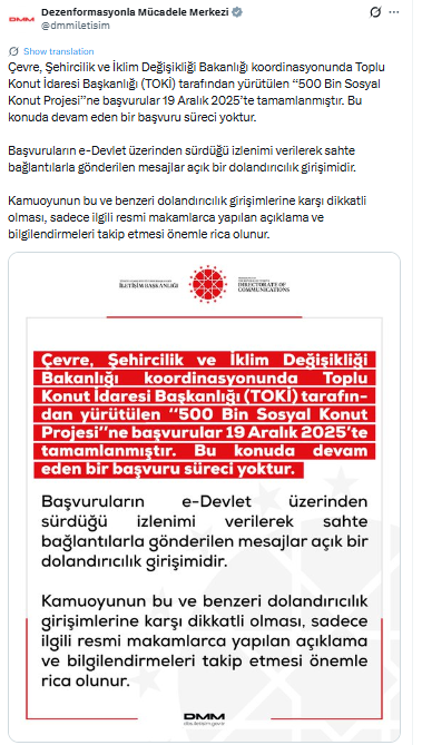 Cumhurbaşkanlığı İletişim Başkanlığı Dezenformasyonla Mücadele Merkezi (DMM), “500 Bin Sosyal Konut Projesi” ile ilgili kamuoyunu yanıltan paylaşımlara dikkat çekti. DMM, başvuru sürecinin sürdüğü iddiasıyla yapılan duyuru ve mesajların gerçeği yansıtmadığını ve dolandırıcılık amacı taşıdığını açıkladı.