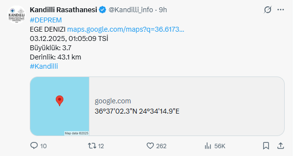 Sosyal medya hesabı üzerinden yapılan paylaşımda Ege Denizi'nde meydana gelen depremin 3.7 büyüklüğünde gerçekleştiği. Kandilli Rasathanesi'nin verilerine göre saat 01.05'te meydana gelen deprem 43.1 kilometre derinlikte kaydedildi.