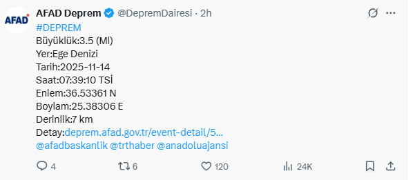 Sosyal medya hesabı üzerinden yapılan paylaşımda sabah 07.39'da meydana gelen depremin 3.5 büyüklüğünde gerçekleştiği belirtildi. AFAD bu depremin derinliğini 7 kilometre olarak açıkladı.