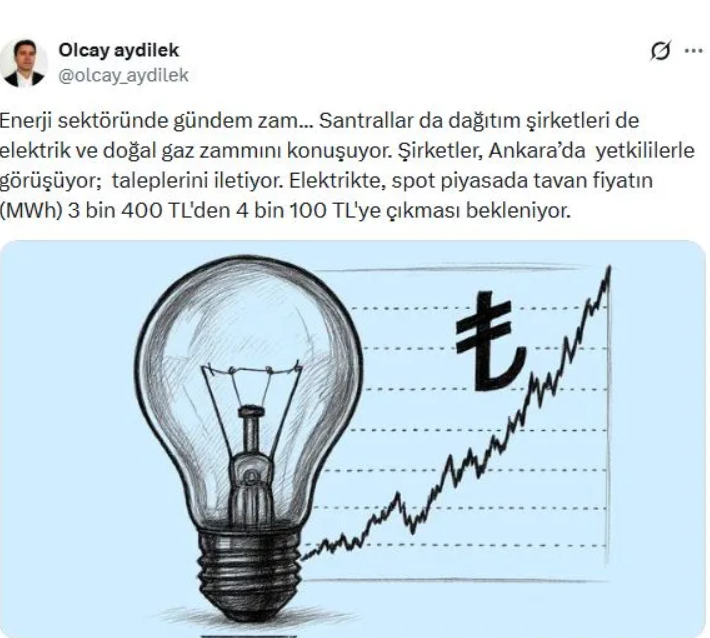 Aydilek'in sosyal medya platformu X hesabından yaptığı paylaşımda, "Enerji sektöründe gündem zam... Santrallar da dağıtım şirketleri de elektrik ve doğal gaz zammını konuşuyor. Şirketler, Ankara’da yetkililerle görüşüyor; taleplerini iletiyor. Elektrikte, spot piyasada tavan fiyatın (MWh) 3 bin 400 TL'den 4 bin 100 TL'ye çıkması bekleniyor" ifadeleri yer aldı.