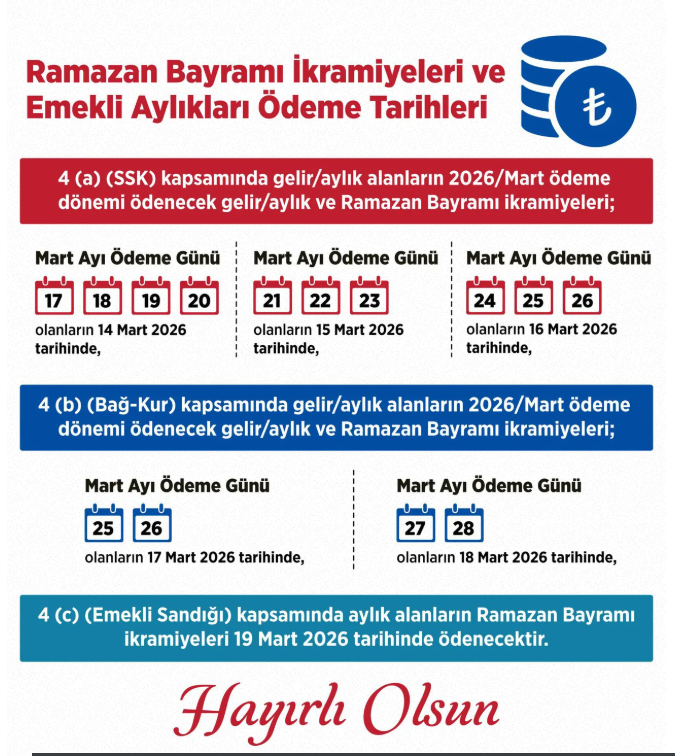 Emekli Sandığı bünyesinde aylık alanların Ramazan Bayramı ikramiyeleri ise tek seferde 19 Mart 2026 tarihinde banka hesaplarına yatırılacak.