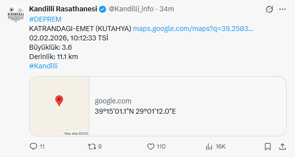 Kandilli Rasathanesi depremin ardından sosyal medya hesabı üzerinden paylaşım yaptı. Kandilli yaptığı paylaşımda depremin saat 10.12'de 3.6 büyüklüğünde meydana geldiğini belirtti. Merkezi Emet olan depremin derinliği 11.1 kilometre olarak açıklandı.