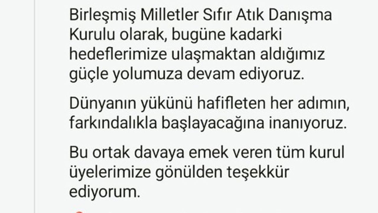 "Birleşmiş Milletler Sıfır Atık Danışma Kurulu olarak, bugüne kadarki hedeflerimize ulaşmaktan aldığımız güçle yolumuza devam ediyoruz. Dünyanın yükünü hafifleten her adımın, farkındalıkla başlayacağına inanıyoruz. Bu ortak davaya emek veren tüm kurul üyelerimize gönülden teşekkür ediyorum."