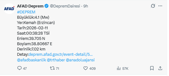 AFAD’ın sosyal medya hesabı üzerinden paylaştığı verilere göre Erzincan’ın Kemah ilçesinde saat 00.38’de 4.1 büyüklüğünde deprem meydana geldi. Depremin derinliği ise 7.02 kilometre olarak kaydedildi.