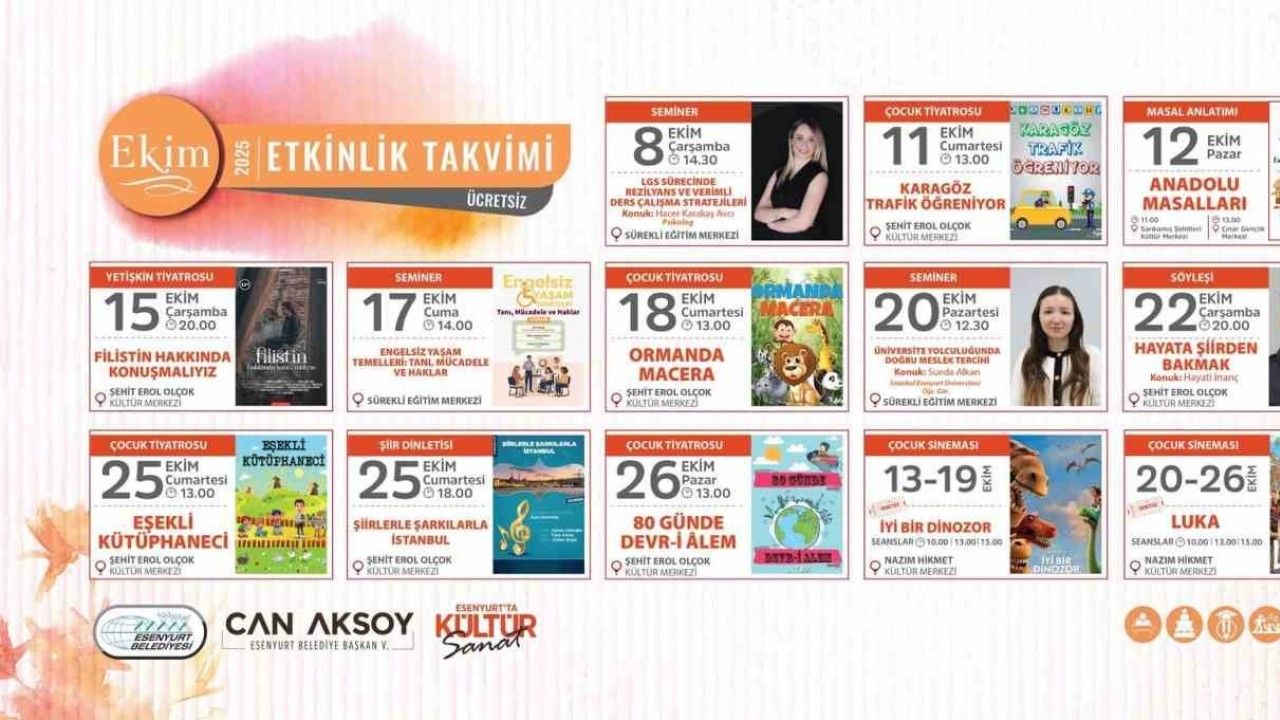 Esenyurt Belediyesi, ekim ayı için kültür, sanat ve eğitim etkinlikleriyle dolu dolu bir program hazırladı. Her yaş grubuna hitap eden etkinlik takvimi; seminerlerden çocuk tiyatrolarına, şiir etkinliklerinden sinema gösterimlerine kadar birçok farklı içeriği kapsıyor.