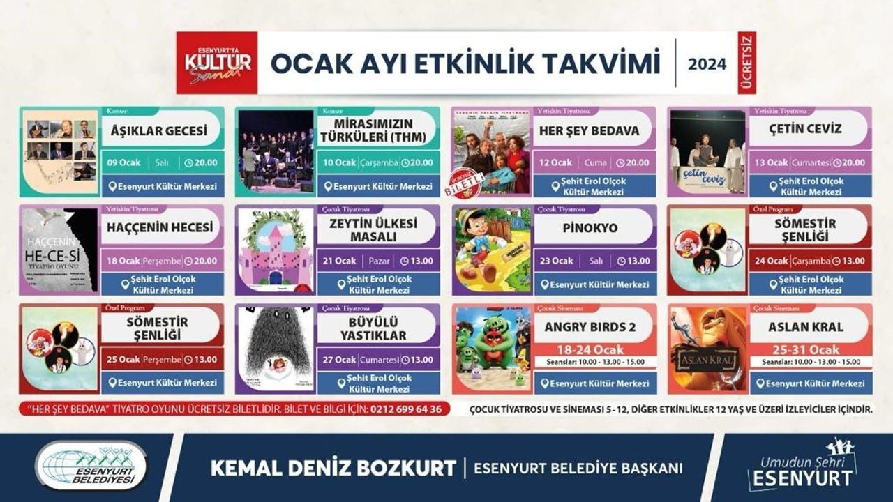 Düzenlenen etkinlikler çerçevesinde 9 Ocak’ta Esenyurt Kültür Merkezi’nde başlayacak Âşıklar Gecesi Özel Programı’nın ardından, Şehit Erol Olçok Kültür Merkezi’nde Yasemin Yalçın, İlyas İlbey gibi usta tiyatrocuların yer aldığı “Her şey Bedava” isimli tiyatro oyunu izleyiciyle buluşacak. Sanatseverlerden tam not alan “Çetin Ceviz” isimli yetişkin tiyatrosunun gösterime sunulacağı programın hemen ardından yine bir yetişkin oyunu olan “Haççenin Hecesi” isimli tiyatro oyununun gösterimi yapılacak. Yarıyıl tatiline giren çocukların da unutulmadığı etkinlik programında “Sömestr Şenliği” ile eğlenecek olan minikler: “Pinokyo”, “Büyülü Yastıklar ve Zeytin Ülkesi Masalı” gibi tiyatro oyunlarıyla ufuklarını genişletecek. Ayrıca çocukların beğeniyle izlediği animasyon film gösterimleri ocak ayı takviminde belirlenen günlerde yerini aldı.