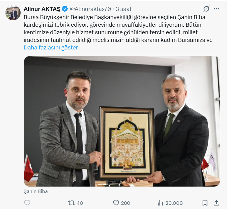 "Bursa Büyükşehir Belediye Başkanvekilliği görevine seçilen Şahin Biba kardeşimizi tebrik ediyor, görevinde muvaffakiyetler diliyorum. Kendisinin kentimize layığıyla hizmet edeceğine gönülden inanıyor, millet iradesinin yansıması olan meclisimizin aldığı kararın kadim Bursamıza ve kıymetli hemşehrilerimize hayırlı olmasını yüce Allah'tan diliyorum."