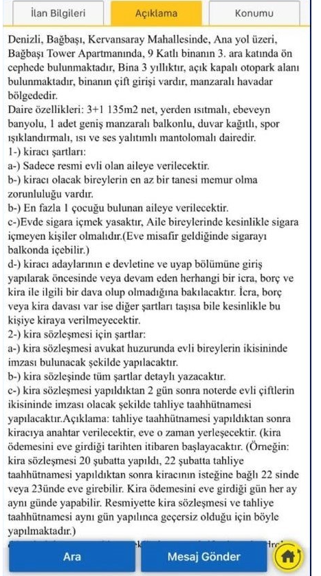 Denizli’de 3+1 dairesini 35 bin liraya kiraya vermek isteyen bir ev sahibinin ilan sitesinde paylaştığı 3 sayfalık kriter listesi, sosyal medyada ve kamuoyunda tartışma oluşturdu. İlanda yer alan şartlar arasında yalnızca resmi nikâhlı ailelere kiralama yapılacağı, en az bir aile bireyinin memur olması gerektiği, en fazla bir çocuklu ailelerin kabul edileceği belirtildi. Ev içinde sigara içilmesinin kesinlikle yasak olduğu, mutfak tezgâhında kirli bulaşık bırakılmaması ve tezgâhın ıslak tutulmaması gibi detaylar da dikkat çekti. Ayrıca evde kullanılacak tüm eşyaların ayaklarında zemini korumak için keçe bulunması, eşyalar ile duvar arasında boşluk bırakılması ve evin 50 günde bir kiracının uygunluğunda 15 dakika süreyle kontrol edileceği maddeleri yer aldı. Söz konusu ilan, kiracı adayları ve vatandaşlar tarafından "aşırı kuralcı" bulunarak eleştirildi.