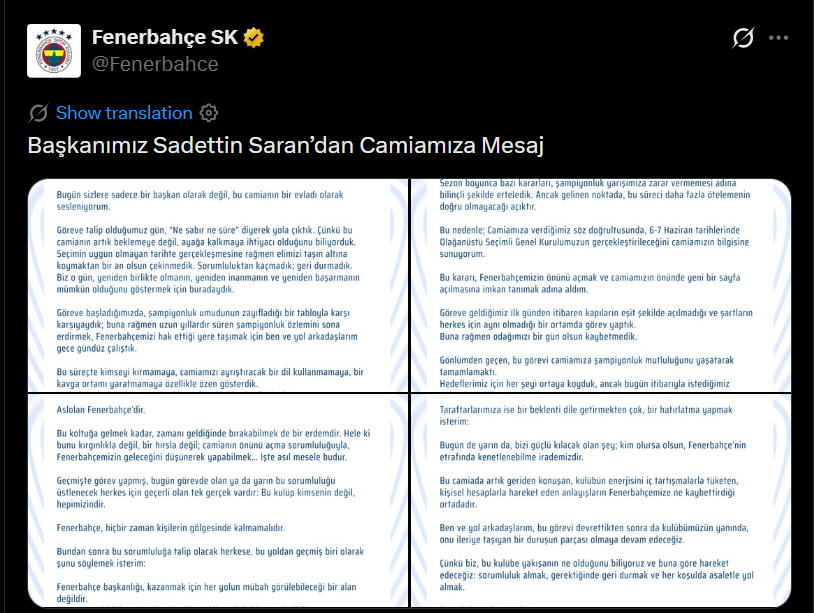 Ben, verdiğim söz üzerine; herkesin geri durduğu bir dönemde başkanlık yarışına girdim. Yine ben, verdiğim söz üzerine bugün camiamın karşısına çıkıyorum. Hepinizin yakından bildiği üzere görev süremizin henüz başında yaşanan saha dışı gelişmeler ve oluşan şartlar, o gün farklı bir değerlendirme yapmamızı mümkün kılmamıştı.