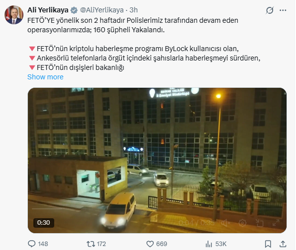 Bakan Yerlikaya’nın paylaşımına göre, yakalanan şüphelilerin; FETÖ’nün kriptolu haberleşme programı ByLock kullanıcısı oldukları, ankesörlü telefonlar aracılığıyla örgüt içi iletişimi sürdürdükleri, örgütün Dışişleri Bakanlığı mahrem hizmetler, güncel yapılanma, eğitim, finans ve askeri mahrem yapılanmaları içerisinde faaliyet gösterdikleri tespit edildi.