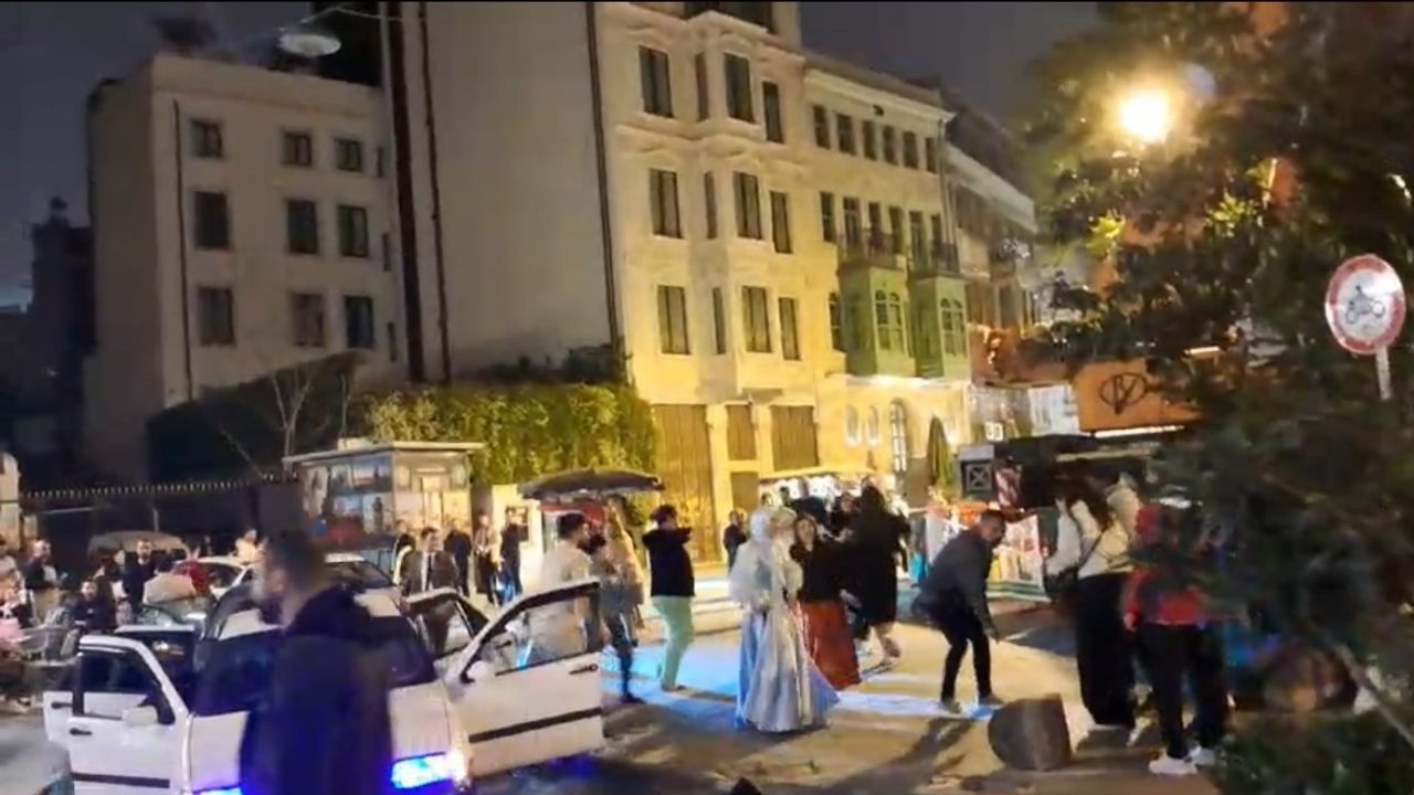 Beyoğlu Galata Kulesi Meydanı’na gece yarısı araçlarla nişan eğlencesi için gelen bir grup, hastaneye giden tek yolu trafiğe kapattı. Araçlarından inen grup ardından meydanda “Erik Dalı” şarkısıyla dakikalarca eğlendi. Yüksek sesli müzikler eşliğinde sözde eğlenen grup, semt sakinlerine rahatsızlık verdiği yetmiyormuş gibi bir de bağırdı. Dakikalarca yolu trafiğe kapatan grup, eğlenceyi bırakarak araçlarına binip ayrıldı. Pes dedirten o anlar ise cep telefonu kamerasına saniye saniye yansıdı.