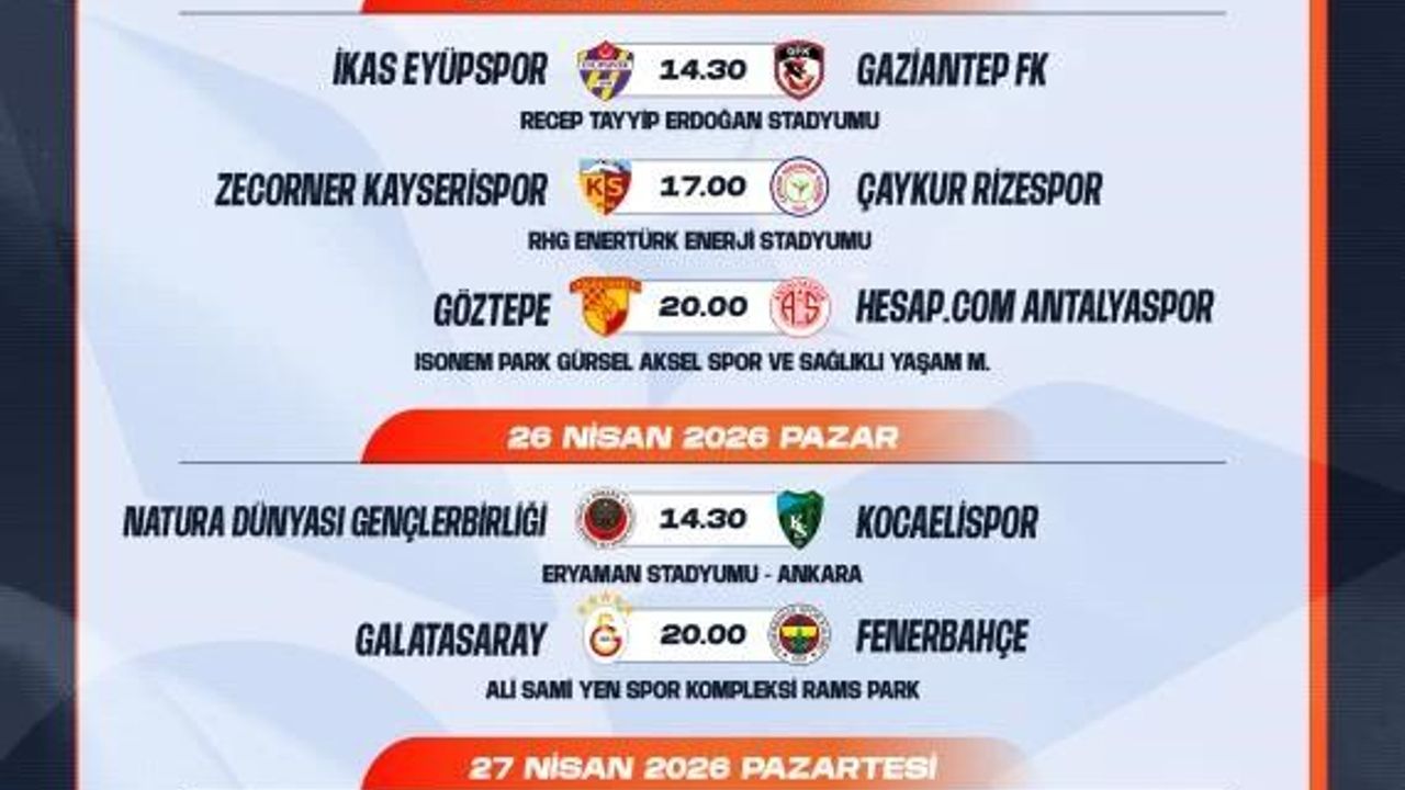 Trendyol Süper Lig'de 29, 30 ve 31. haftada oynanacak maçların programı açıklandı. Türkiye Futbol Federasyonu'nun internet sitesinden duyurulan programa göre, 31. haftadaki Galatasaray - Fenerbahçe derbisi 26 Nisan Pazar günü saat 20.00'de yapılacak.
