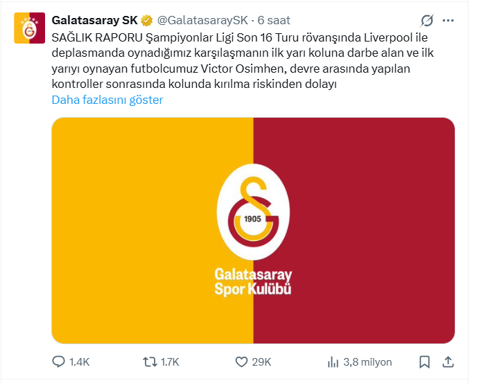 Konuyla ilgili sarı-kırmızılı ekipten yapılan açıklamada, "Şampiyonlar Ligi Son 16 Turu rövanşında Liverpool ile deplasmanda oynadığımız karşılaşmanın ilk yarısında koluna darbe alan ve ilk yarıyı tamamlayan futbolcumuz Victor Osimhen, devre arasında yapılan kontroller sonrasında kolunda kırık olma riskinden ötürü karşılaşmanın ikinci yarısında oynatılmadı. Maç sonrasında sağlık ekibimizin denetiminde hastanede yapılan kontrolde futbolcumuzun sağ ön kolunda kırık olduğu tespit edildi ve alçı yapıldı. Yapılacak değerlendirmeler sonrasında ameliyat konusundaki karar önümüzdeki günlerde verilecektir. Aynı mücadelenin ikinci yarısında yaralanma yaşayan futbolcumuz Noa Lang’ın sağ baş parmağında ciddi bir kesik oldu ve maç sonrasında Liverpool’da önümüzdeki saatlerde sağlık ekibimizin katılacağı bir operasyona alınması planlandı" denildi.