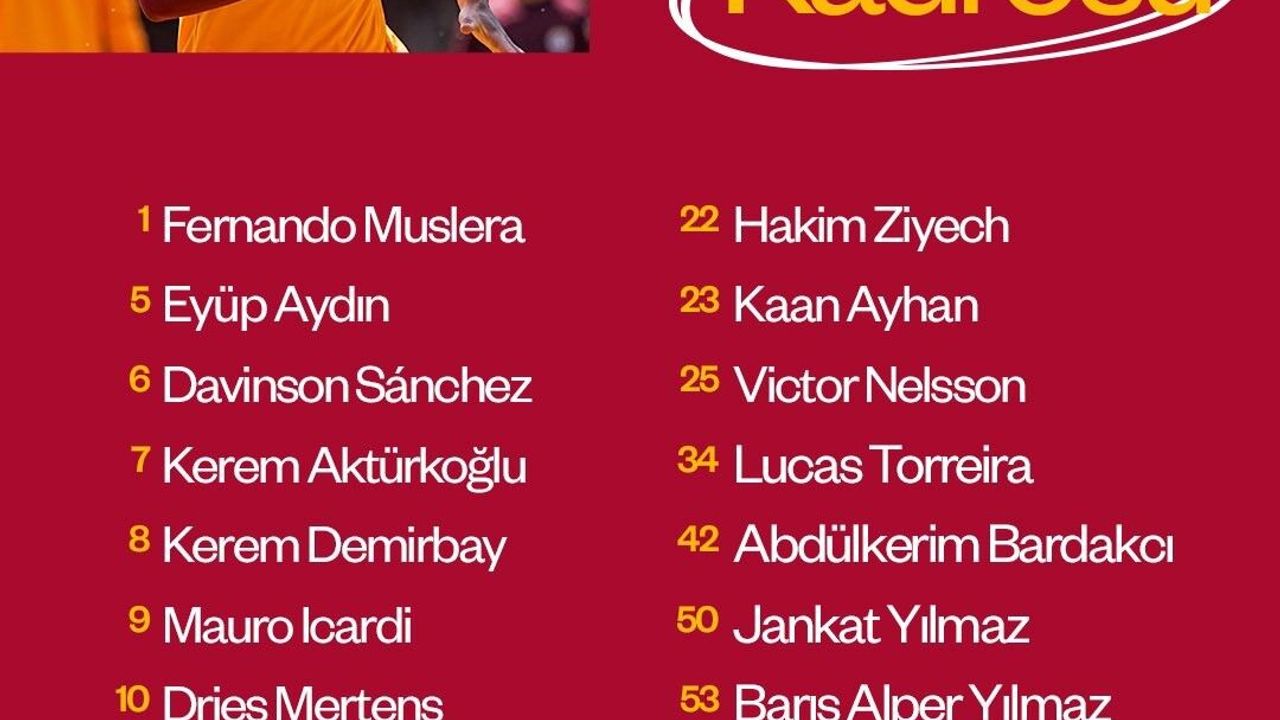 "Fernando Muslera, Eyüp Aydın, Davinson Sanchez, Kerem Aktürkoğlu, Kerem Demirbay, Mauro Icardi, Dries Mertens, Wilfried Zaha, Derrick Köhn, Berkan Kutlu, Mateus Tete, Hakim Ziyech, Kaan Ayhan, Victor Nelsson, Lucas Torreira, Abdülkerim Bardakcı, Jankat Yılmaz, Barış Alper Yılmaz, Tanguy Ndombele, Serge Aurier ve Carlos Vinicius."
