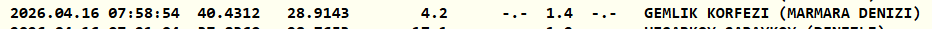 Kandilli Rasathanesi, Marmara Denizi Gemlik Körfezi'nde saat 07.58'de 1.4 büyüklüğünde deprem meydana geldiğini duyurdu. Depremin derinliği 4.2 kilometre olarak ölçüldü.