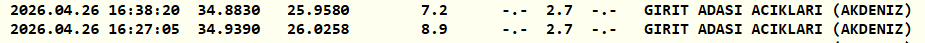 Kandilli Rasathanesi Akdeniz Girit Adası açıklarında peş peşe deprem meydana geldiğini duyurdu. Kandilli'nin paylaştığı verilere göre ilk deprem saat 16.27'de 2.7 büyüklüğünde gerçekleşti. İkinci deprem ise 16.38'de yine 2.7 büyüklüğünde meydana geldi. Depremlerin derinlikleri sırasıyla 8.9, 7.2 kilometre ölçüldü.