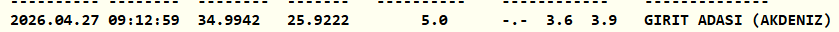 Kandilli Rasathanesi Girit Adası'nda 3.6 büyüklüğünde deprem meydana geldiğini duyurdu. Saat 09.12'de gerçekleşen depremin derinliği 5.0 kilometre olarak ölçüldü.