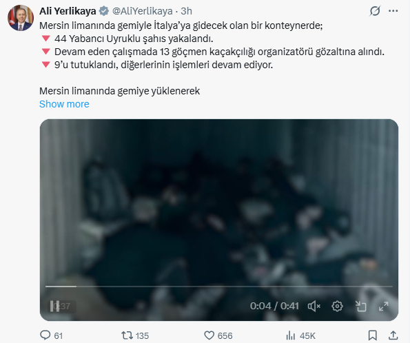Bakan Yerlikaya’nın aktardığı bilgiye göre, Mersin Emniyet Müdürlüğü Göçmen Kaçakçılığıyla Mücadele ve Hudut Kapıları Şube Müdürlüğü ekiplerinin gerçekleştirdiği operasyonda, bir tır garajında bekletilen ve gemiye yüklenmek üzere limana getirilen konteynerde düzensiz göçmenler tespit edildi.