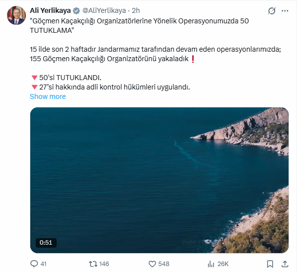 Paylaşımda, göç yönetiminin güvenlik boyutunun; insan ticareti, düzensiz göç ve göçmen kaçakçılığıyla mücadelede hukuk devleti ilkeleri ve insan haklarına riayet esas alınarak yürütüldüğü vurgulandı. Bu kapsamda sınır güvenliğinin ileri teknoloji ve gelişmiş izleme-denetim sistemleriyle güçlendirildiği, yasa dışı göçü organize eden yapılara karşı sahada ve hukuki zeminde kararlı mücadelenin sürdüğü kaydedildi.