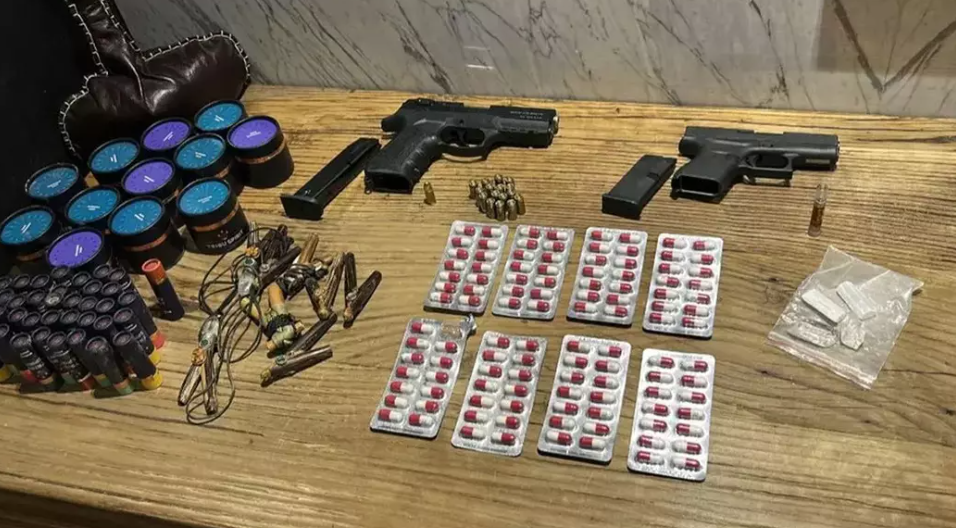 Şüphelilerin evinde yapılan aramalarda, 3 ruhsatsız tabanca, 111 adet uyuşturucu hap, 4 parça kristal şeklinde uyuşturucu madde, çok sayıda uyuşturucu madde kullanmaya yarayan aparatlar ve uyuşturucu madde öğütücüsü, 9 deste üstünde ve altında 100'er dolar bulunan boş kağıtlarının bulunduğu deste ve 19 adet orta kısımları kesik sahte dolar ele geçirildi.