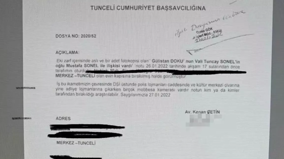 Sabah'tan Ercan Topaç'ın haberine göre kapıya bırakılan notta "Gülistan Doku'nun Vali Tuncay Sonel'in oğlu Mustafa Sonel ile ilişkisi vardı" ifadelerinin yer aldığı görüldü.