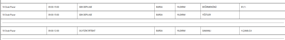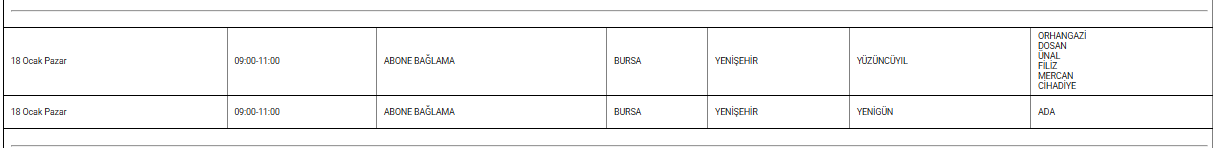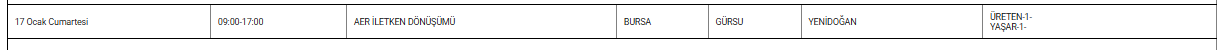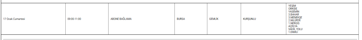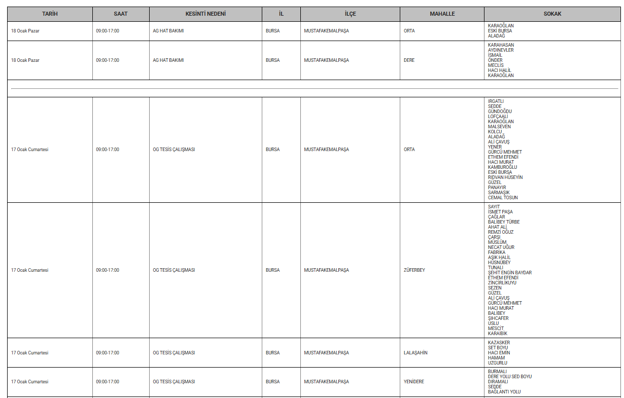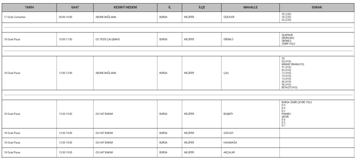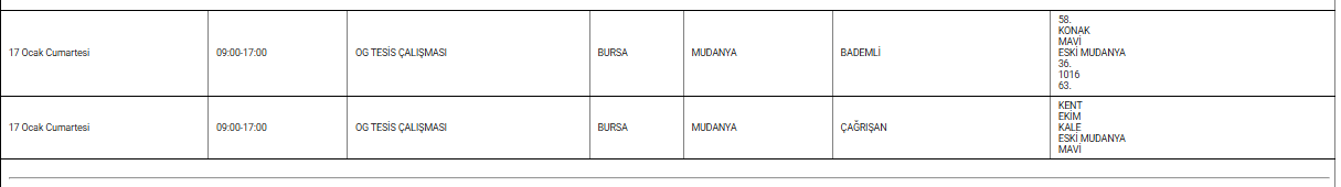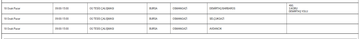 Kesintilerin; abone bağlantı işlemleri, AER iletken dönüşümü, alçak gerilim (AG) ve orta gerilim (OG) tesis çalışmaları, hat bakımları, OG müşterilerinden gelen talepler, SDK deplase işlemleri ile OG fiziki irtibat çalışmaları nedeniyle gerçekleştirileceği belirtildi. Planlanan çalışmalar kapsamında İnegöl, Gemlik, Gürsu, İznik, Mudanya, Mustafakemalpaşa, Nilüfer, Orhangazi, Osmangazi, Yenişehir ve Yıldırım ilçelerindeki bazı mahallelerde elektrik kesintisi uygulanacak.