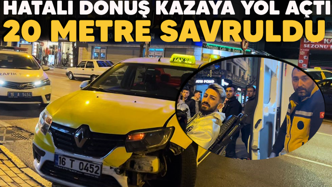 Edinilen bilgiye göre, taksi şoförü olan Oğuz D. 16 T 0452 plakalı ticarî aracıyla ana yol üzerinde u dönüşü yapmak istedi. Bu esnada 16 BCZ 319 plakalı motosikletiyle seyir halindeki Osman C. hatalı dönüş yapan taksicinin kendisine çarpmasıyla yaklaşık 20 metre savruldu. Kazayı gören çevredekiler yaralının yardımına koşarken, ihbar üzerine olay yerine sağlık ekibi sevk edildi. Sağlık ekiplerince ilk müdahalesi yapılan Osman C., Çekirge Devlet Hastanesi'ne sevk edilirken, polis kazayla ilgili tahkikat başlattı.