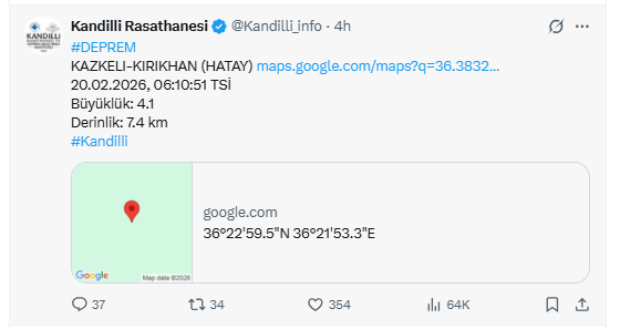 Yapılan paylaşıma göre Kırıkhan merkezli deprem 4.1 büyüklüğünde gerçekleşti. Kandilli Rasathanesi sabah saat 06.10'da meydana gelen depremin yerin 7.4 kilometre derinliğinde gerçekleştiğini belirtti.