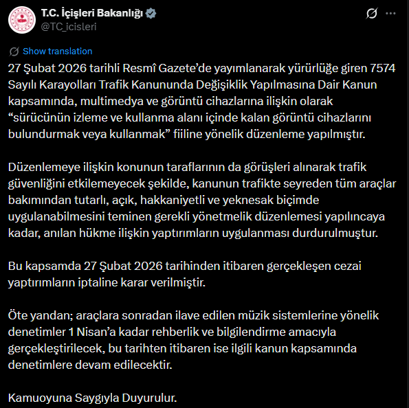 Bakanlıktan yapılan açıklamada, sürücünün izleme ve kullanma alanı içinde kalan görüntü cihazlarının araçlarda bulundurulması veya kullanılması fiiline yönelik düzenleme yapıldığı hatırlatıldı.
