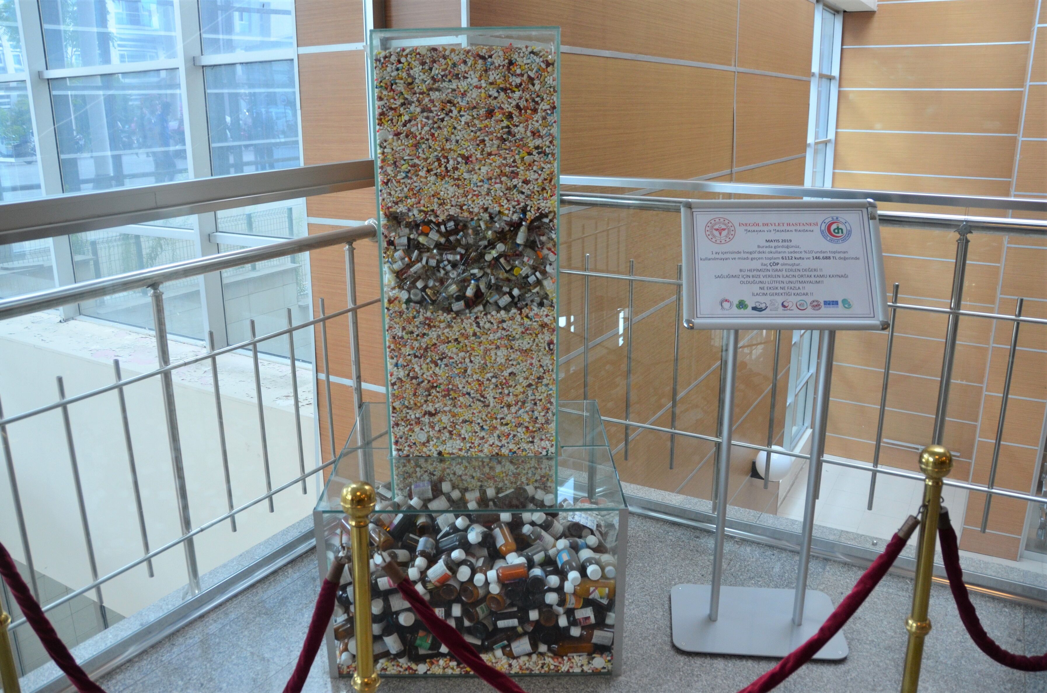 İnegöl Devlet Hastanesi'nde akılcı ilaç kullanımına dikkat çekmek için yapılan bir projede toplanan ilaçlar, her gün tedavi için gelen yüzlerce hastanın dikkatini çekiyor.