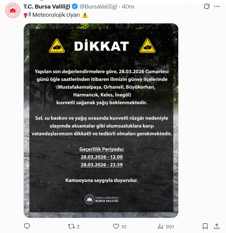 Bursa Valiliği’nin resmi sosyal medya hesabı üzerinden yapılan duyuruda, 6 ilçe için uyarı bilgisi paylaşıldı.