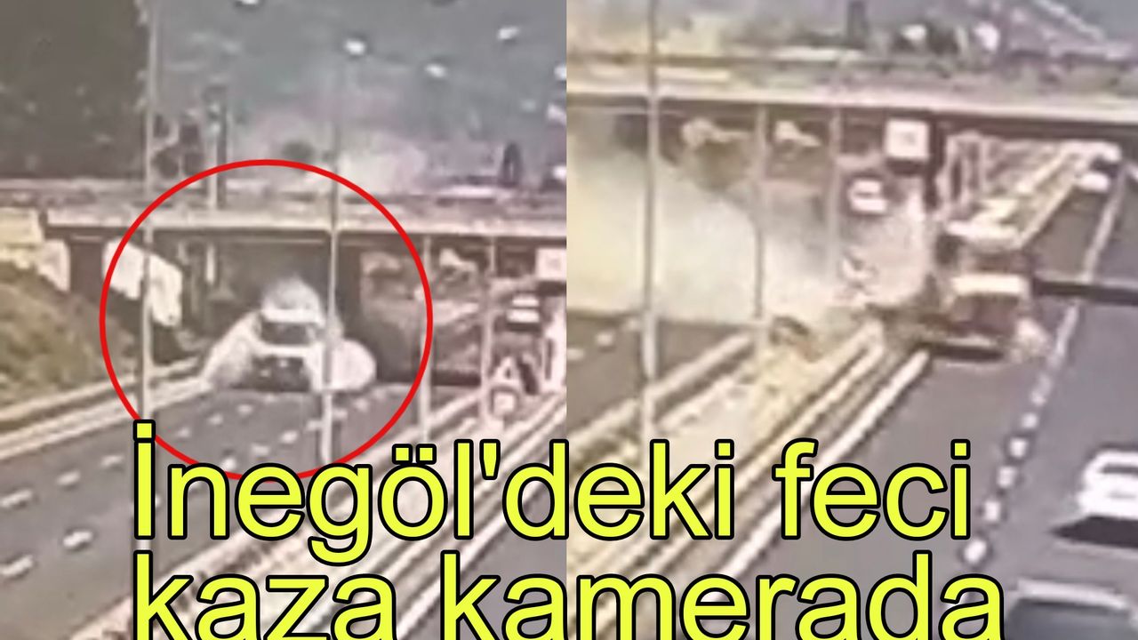 İnegöl de damberi açık kalması sonucu üst geçite çarpıp şarapole uçan kamyonun kazası saniye saniye kameraya yansıdı.