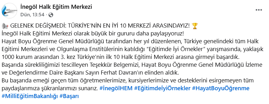 Hayat Boyu Öğrenme Genel Müdürlüğü tarafından her yıl düzenlenen ve ülke genelindeki yaklaşık 1000 Halk Eğitimi Merkezi ile Olgunlaşma Enstitüsü’nün katıldığı yarışmada, İnegöl Halk Eğitimi Merkezi 3. kez Türkiye’nin ilk 10 kurumu arasında yer aldı.