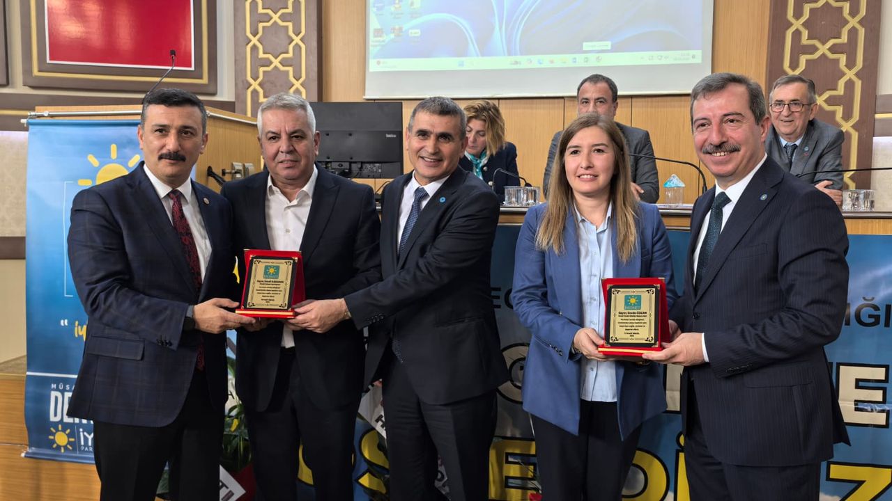Konuşmaların ardından partiye destek veren eski İlçe başkanı İsmail Karaman ve parti belediye Başkan adayı Sevda Özcan'a plaket verildi.
