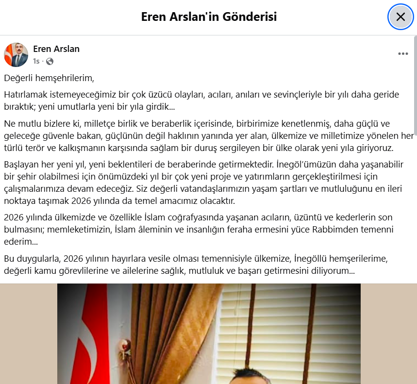 Bu duygularla, 2026 yılının hayırlara vesile olması temennisiyle ülkemize, İnegöllü hemşerilerime, değerli kamu görevlilerine ve ailelerine sağlık, mutluluk ve başarı getirmesini diliyorum..."