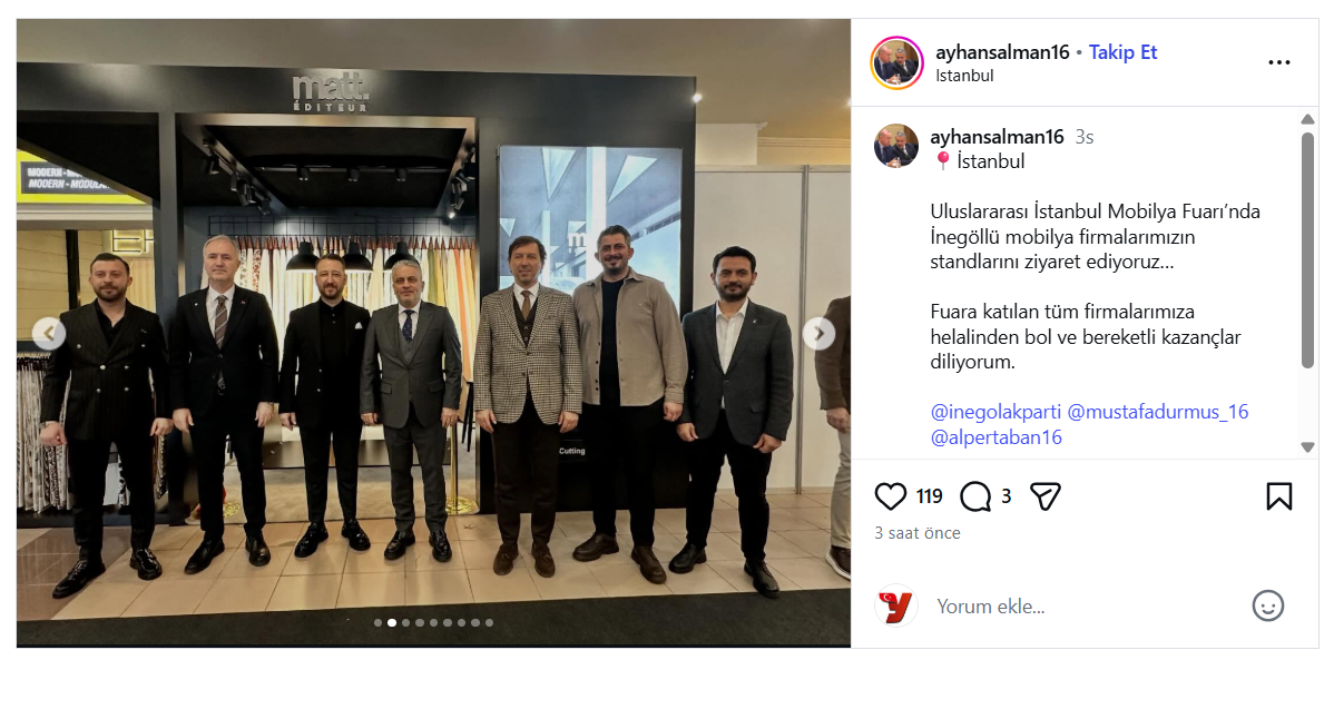 İnegöl Mobilyasının 170 firmayla temsil edildiği IIFF-İstanbul Uluslararası Mobilya Fuarı sürüyor. AK Parti Bursa Milletvekili Ayhan Salman, İnegöl Belediye Başkanı Alper Taban ve AK Parti İnegöl İlçe Başkanı Mustafa Durmuş fuarda İnegöllü Mobilyacıları ziyaret etti.