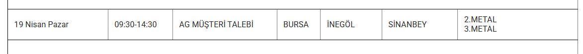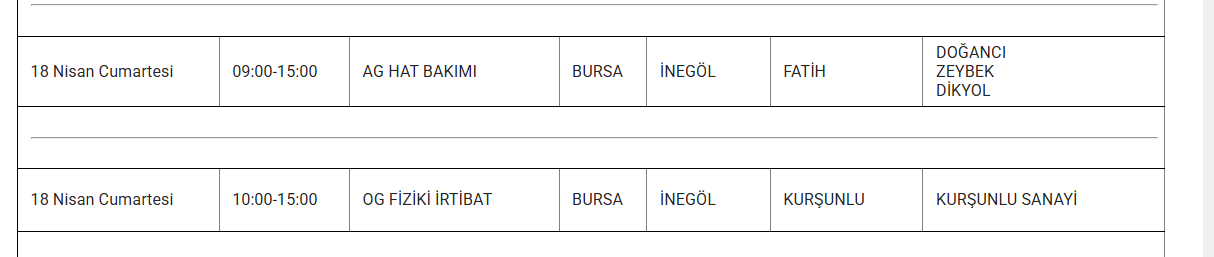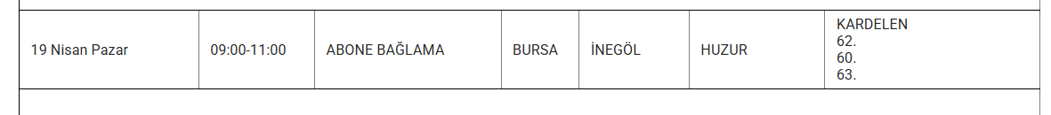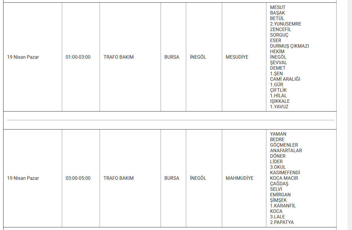 UEDAŞ’ın resmi internet sitesinde yer alan bilgilere göre; abone bağlama, trafo bakımı ve AG müşteri taleplerine yönelik çalışmalar nedeniyle bazı mahallelere belirli saat aralıklarında geçici süreyle elektrik verilemeyecek. Planlanan çalışmalar kapsamında Tokuş, Sungurpaşa, Yeniyörük, Boğazköy, Akçapınar, Çayırlı, Fatih, Kurşunlu, Mesudiye, Mahmudiye, Huzur ve Sinanbey mahalleleri kesintilerden etkileneceği belirtildi.