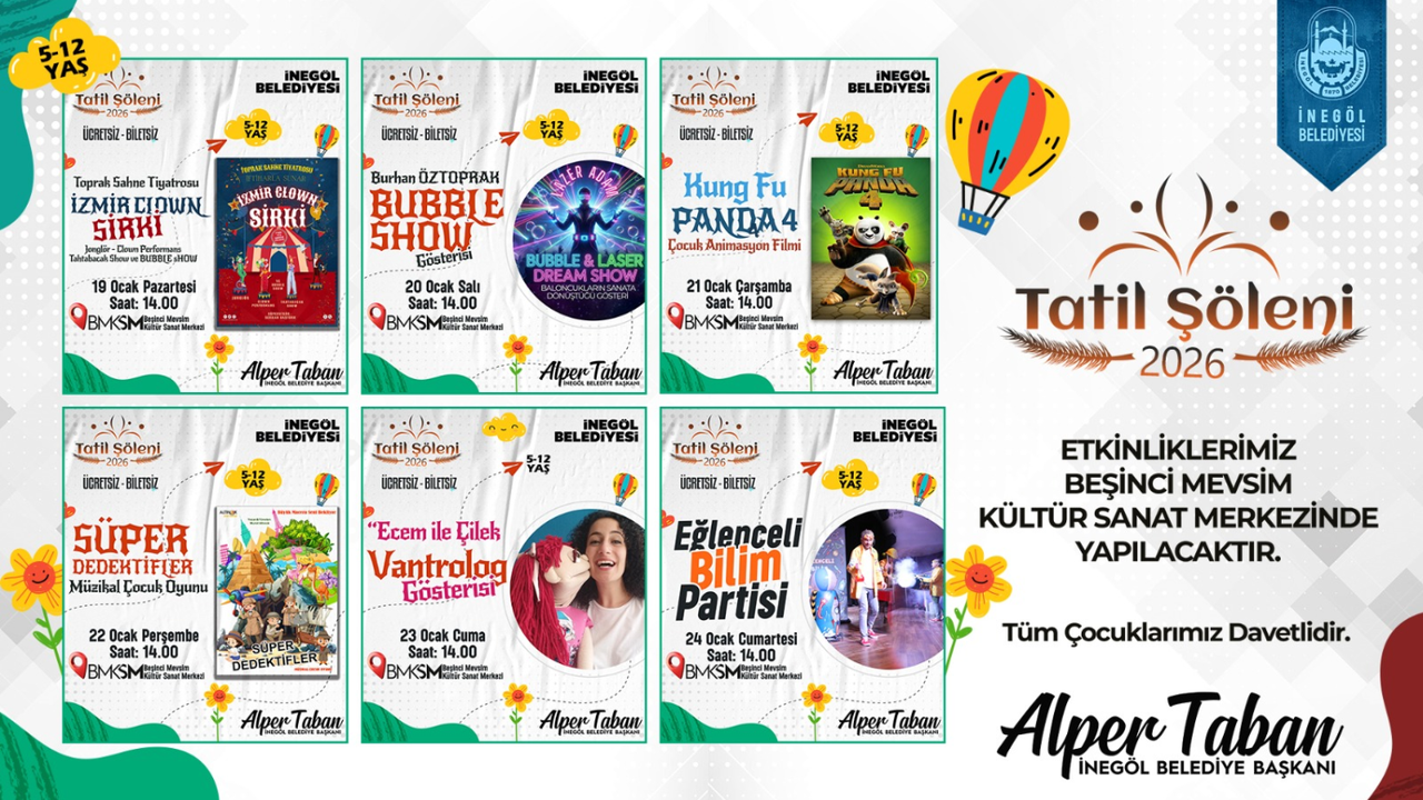 İnegöl Belediye Başkanı Alper Taban, ara tatilde çocukların keyifli ve verimli vakit geçirmesini önemsediklerini belirterek, “Çocuklarımızın yüzünü güldürecek, hayal dünyalarını geliştirecek ve güzel anılar biriktirecekleri bir tatil programı hazırladık. Tüm çocuklarımızı Tatil Şöleni 2026 etkinliklerimize davet ediyorum.” dedi.