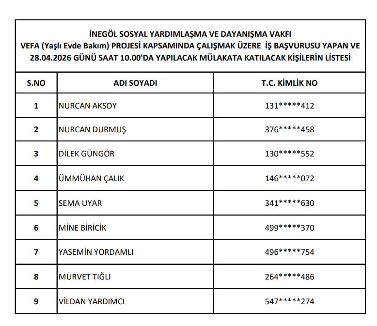 İnegöl Kaymakamlığı’ndan yapılan resmi açıklamada, yaşlılara hizmet verecek kişilerin seçilmesi noktasında yapılacak mülakatın 28 Nisan 2026 Salı Günü saat 10.00’de gerçekleştirileceği açıklandı.