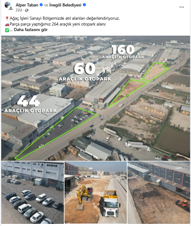 İnegöl Belediye Başkanı Alper Taban, sosyal medya hesabından Ağaç İşleri Sanayi Bölgesi’nde yürütülen dönüşüm çalışmalarına ilişkin bir paylaşım yaptı. Başkan Taban, bölgedeki atıl alanların değerlendirilerek toplam 264 araçlık yeni otopark alanı oluşturulduğunu açıkladı.