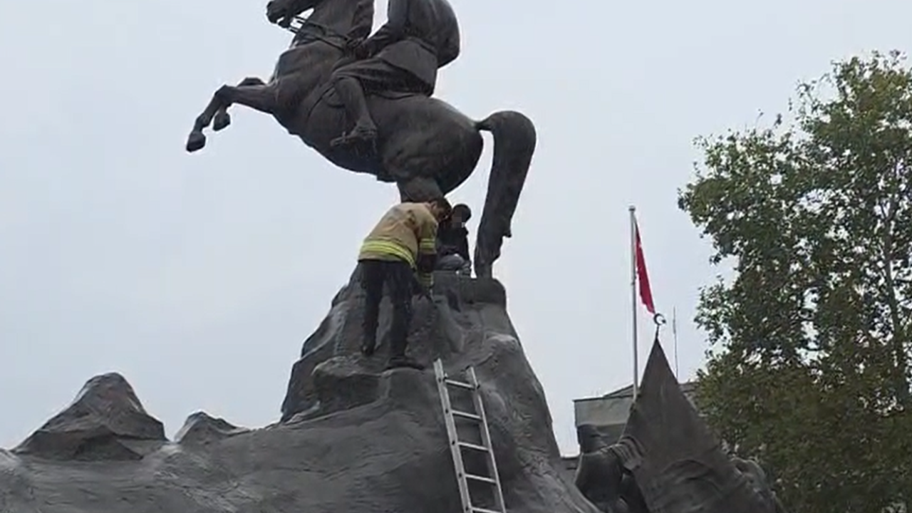 Edinilen bilgiye göre, İnegöl’de Atatürk Anıtının arkasında arkadaşlarıyla oyun oynayan 13 yaşındaki Yusuf H., Atatürk Anıtına çıktı. Bir süre eğlenen küçük çocuk aşağıya inmek istedi ama bir türlü başaramadı. Yağış nedeniyle de kayganlaşan Anıttan bir türlü inemeyen küçük çocuk çevredeki vatandaşlardan yardım istedi. Vatandaşların haber vermesi üzerine olay yerine itfaiye ekipleri geldi. Ekipler Anıt üzerinde mahsur kalan küçük çocuğu merdivenle aşağıya indirdi.